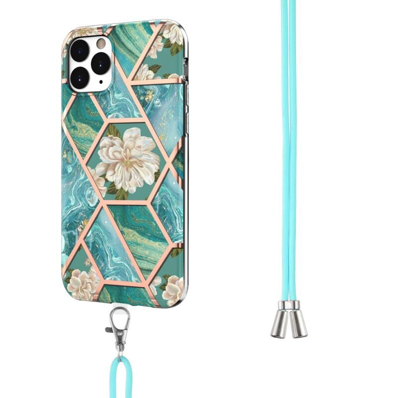 For iPhone 11 Pro Electroplating Splicing Marble Flower Pattern TPU Shockproof Case with Lanyard (Blue Flower)