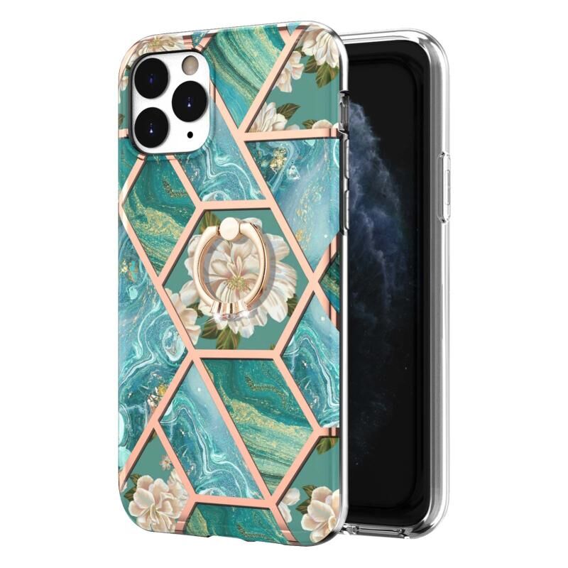 For iPhone 11 Pro Electroplating Splicing Marble Flower Pattern TPU Shockproof Case with Rhinestone Ring Holder (Blue Flower)