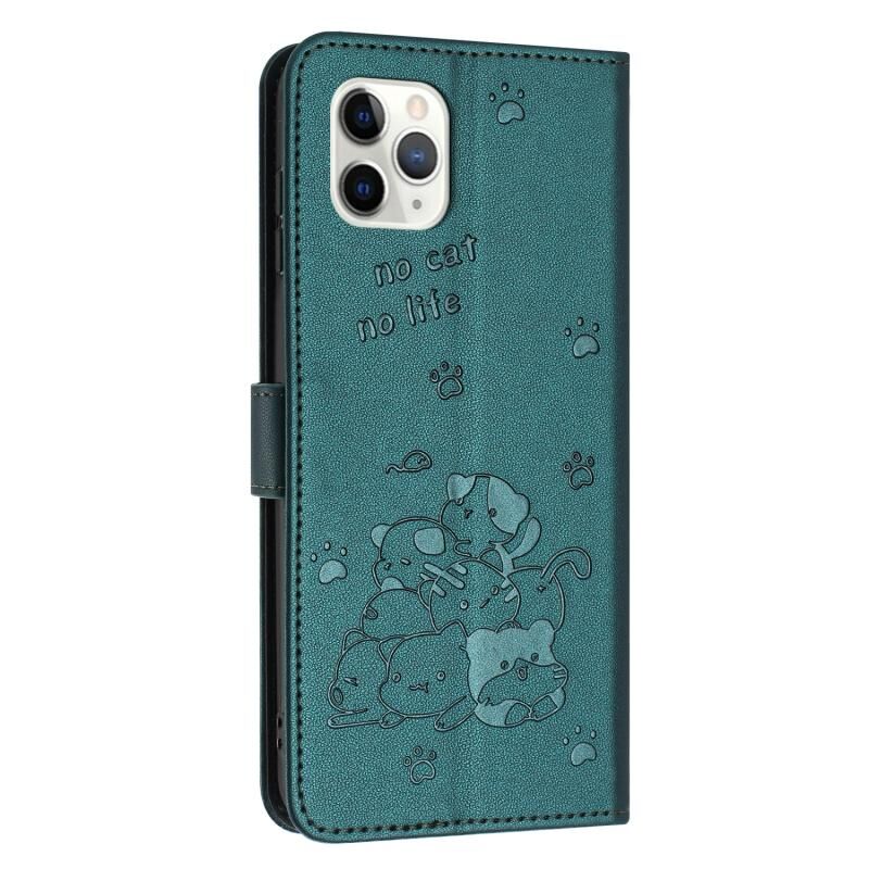 For iPhone 11 Pro Embossed Kitten Phone Leather Case with Lanyard(Dark Green)