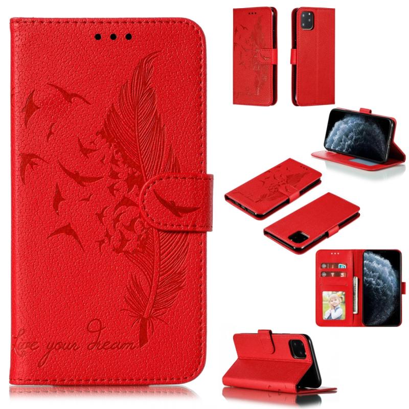 For iPhone 11 Pro Feather Pattern Litchi Texture Horizontal Flip Leather Case with Wallet & Holder & Card Slots (Red)