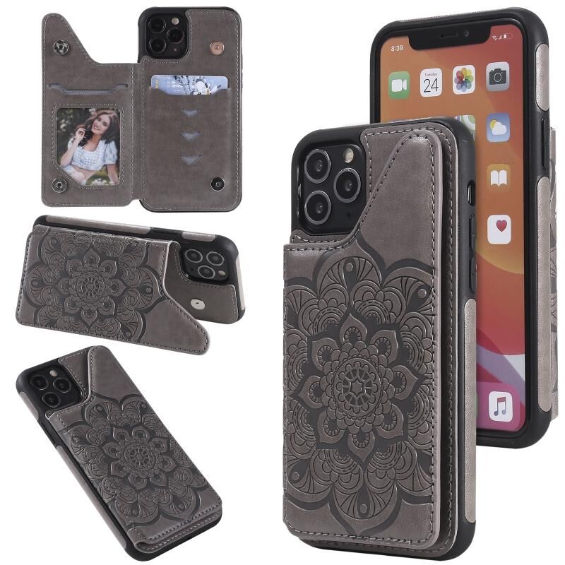For iPhone 11 Pro Flower Embossing Pattern Shockproof Protective Case with Holder & Card Slots & Photo Frame (Grey)