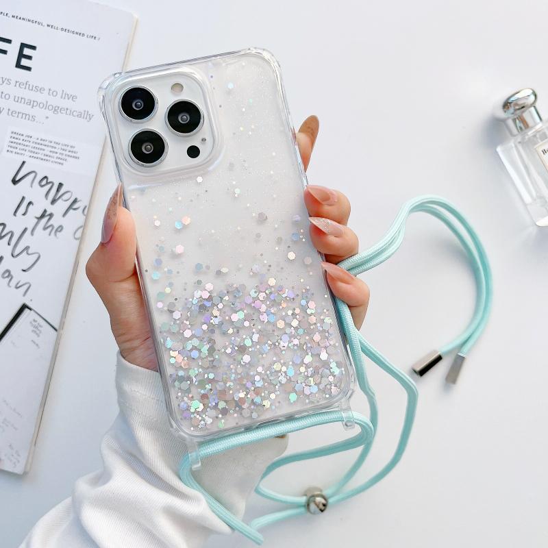 For iPhone 11 Pro Lanyard Glitter Epoxy Clear Phone Case (Blue)