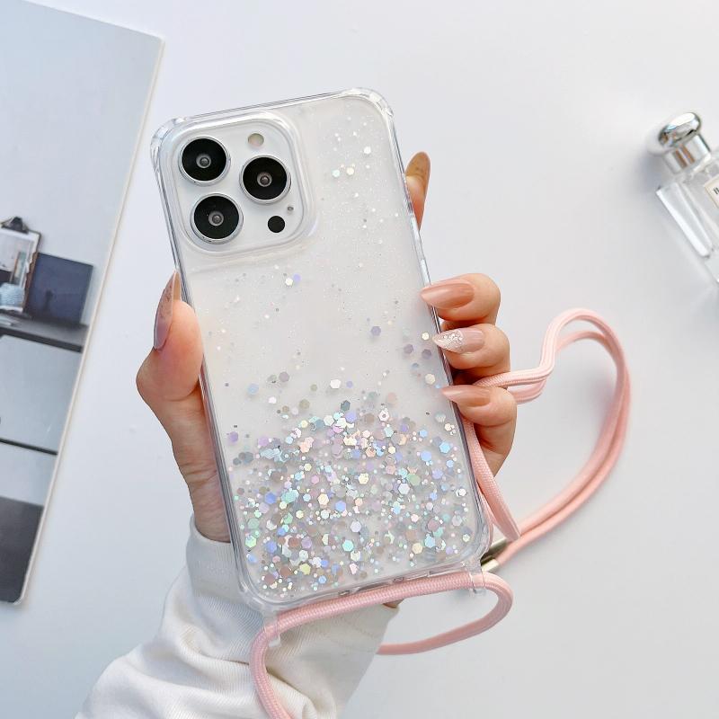 For iPhone 11 Pro Lanyard Glitter Epoxy Clear Phone Case (Pink)