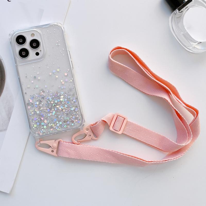For iPhone 11 Pro Lanyard Glitter Epoxy Clear Phone Case (Pink)