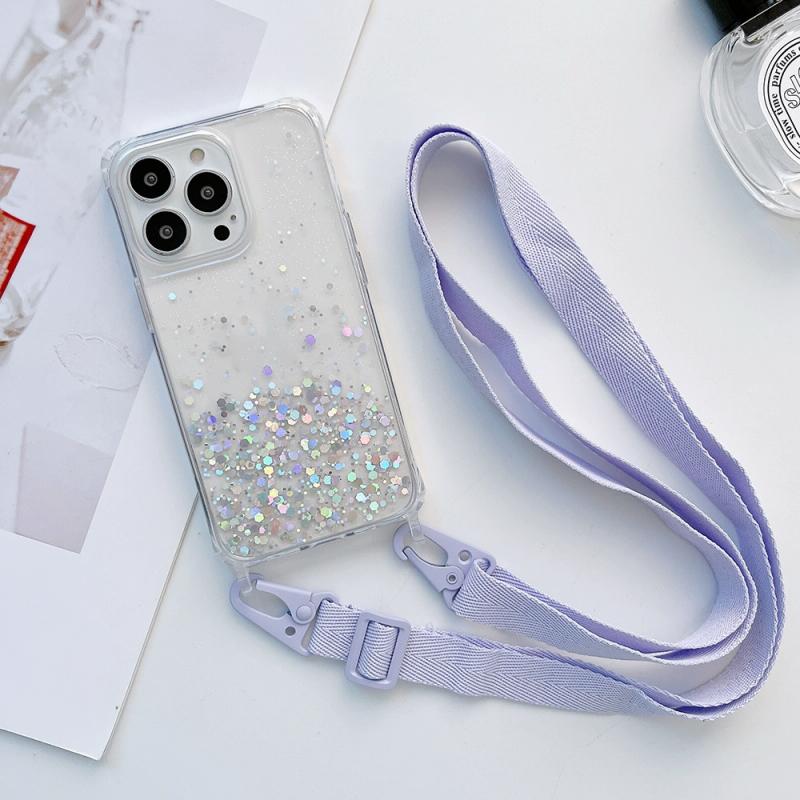 For iPhone 11 Pro Lanyard Glitter Epoxy Clear Phone Case (Purple)