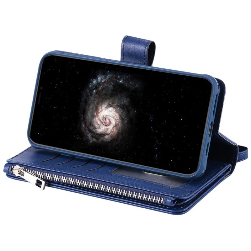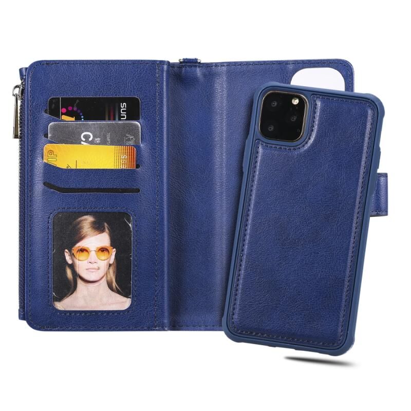 For iPhone 11 Pro Max 2 in 1 Solid Color Zipper Shockproof Protective Case with Card Slots & Bracket & Photo Holder & Wallet Function(Blue)