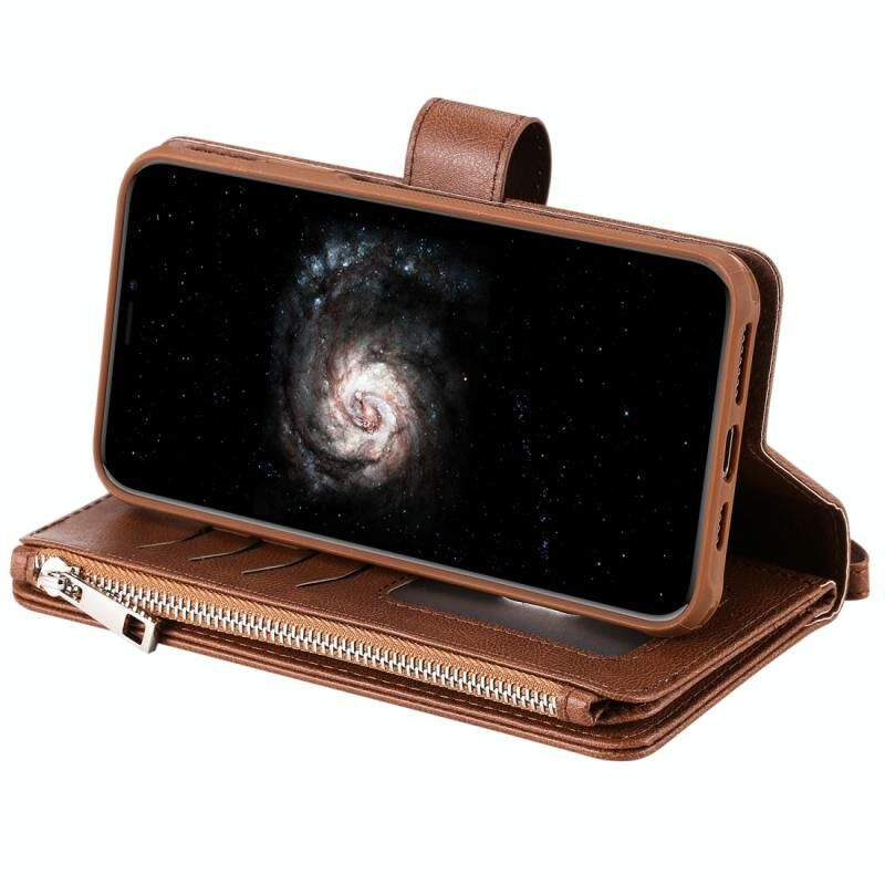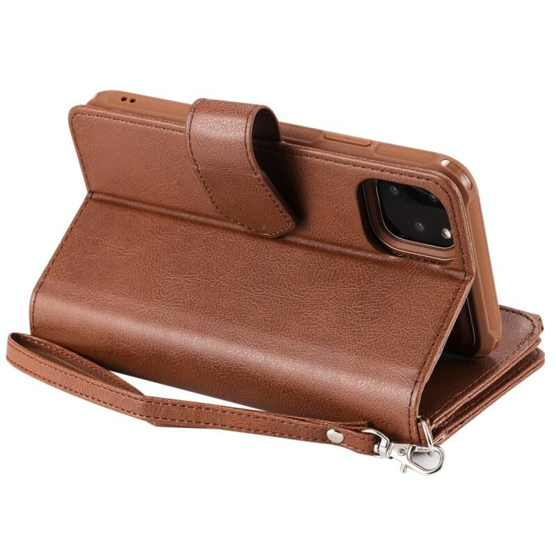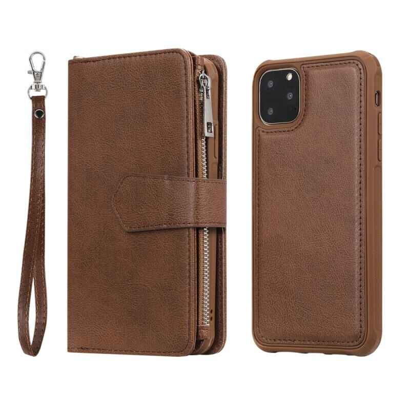For iPhone 11 Pro Max 2 in 1 Solid Color Zipper Shockproof Protective Case with Card Slots & Bracket & Photo Holder & Wallet Function(Brown)