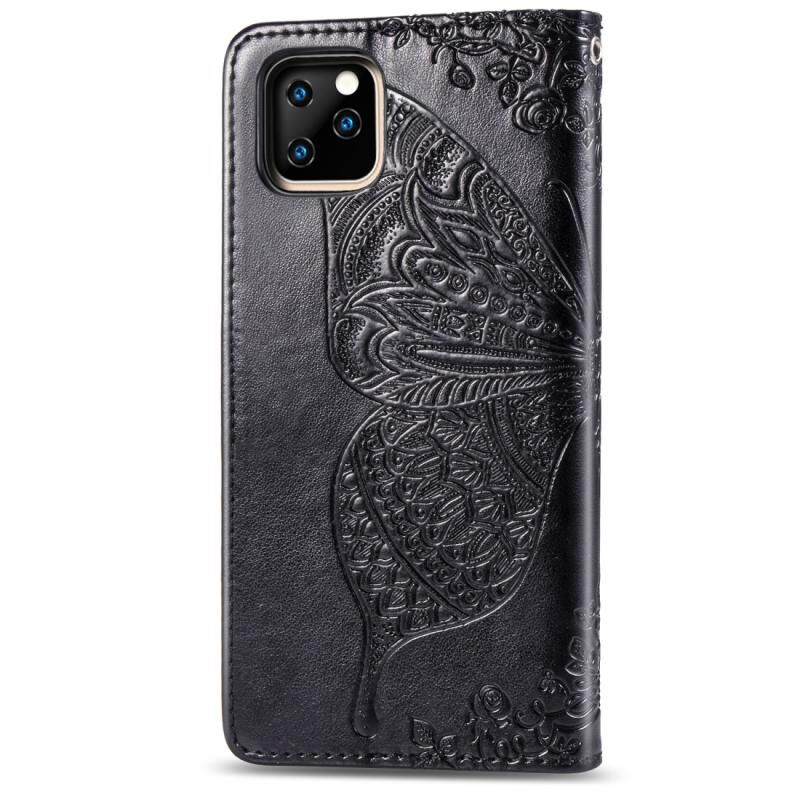 Θήκη δέρματος οριζόντιας αναδίπλωσης για iPhone 11 Pro Max με ανάγλυφο σχέδιο πεταλούδας, λουλουδιών, βάση στήριξης, θήκες καρτών, πορτοφόλι και λουρί (Μαύρο)