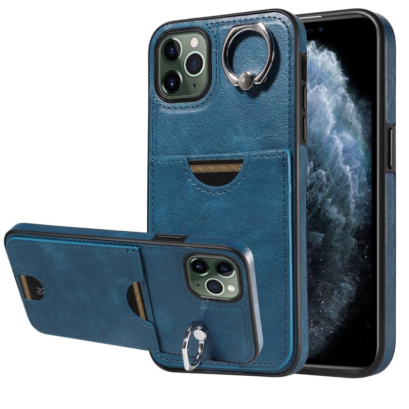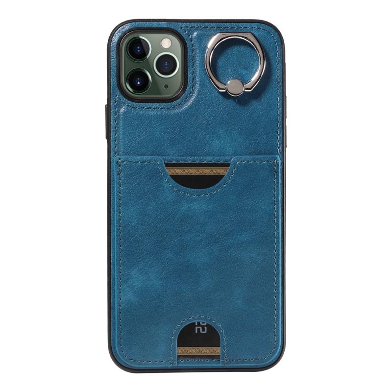 For iPhone 11 Pro Max Calf Texture Card Slot Ring Holder Phone Case(Blue)