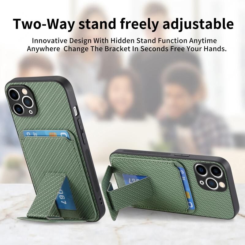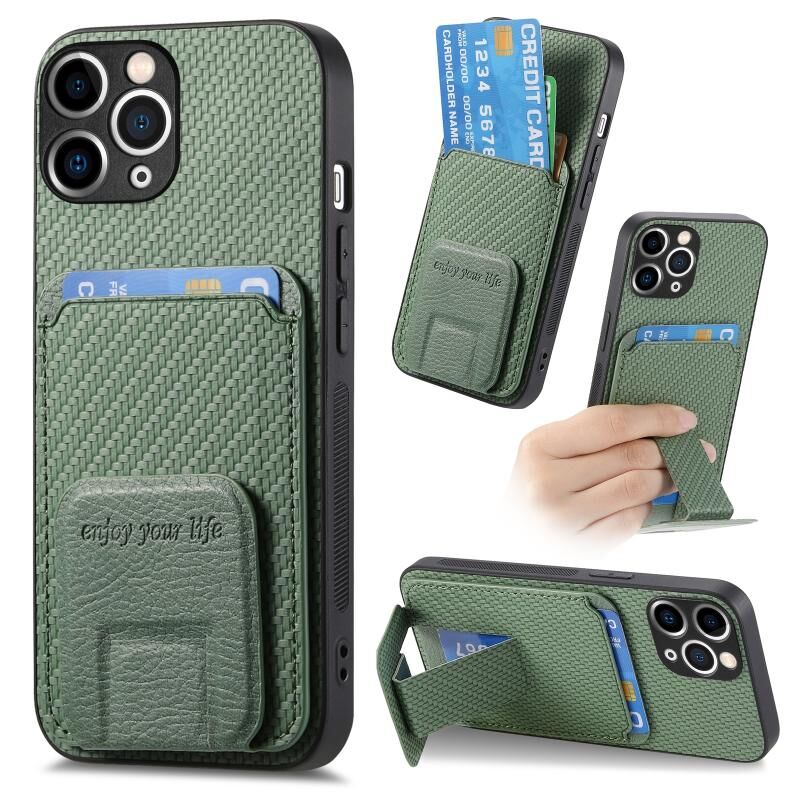 For iPhone 11 Pro Max Carbon Fiber Card Bag Fold Stand Phone Case(Green)