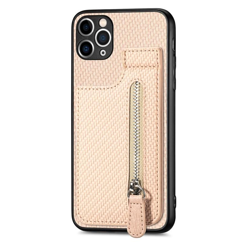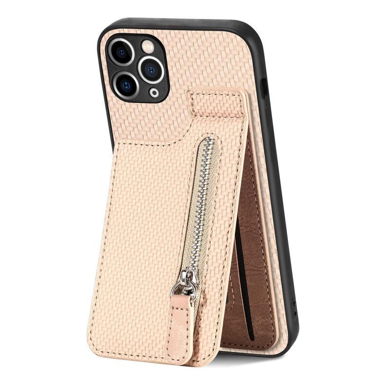 For iPhone 11 Pro Max Carbon Fiber Vertical Flip Zipper Phone Case(Khaki)