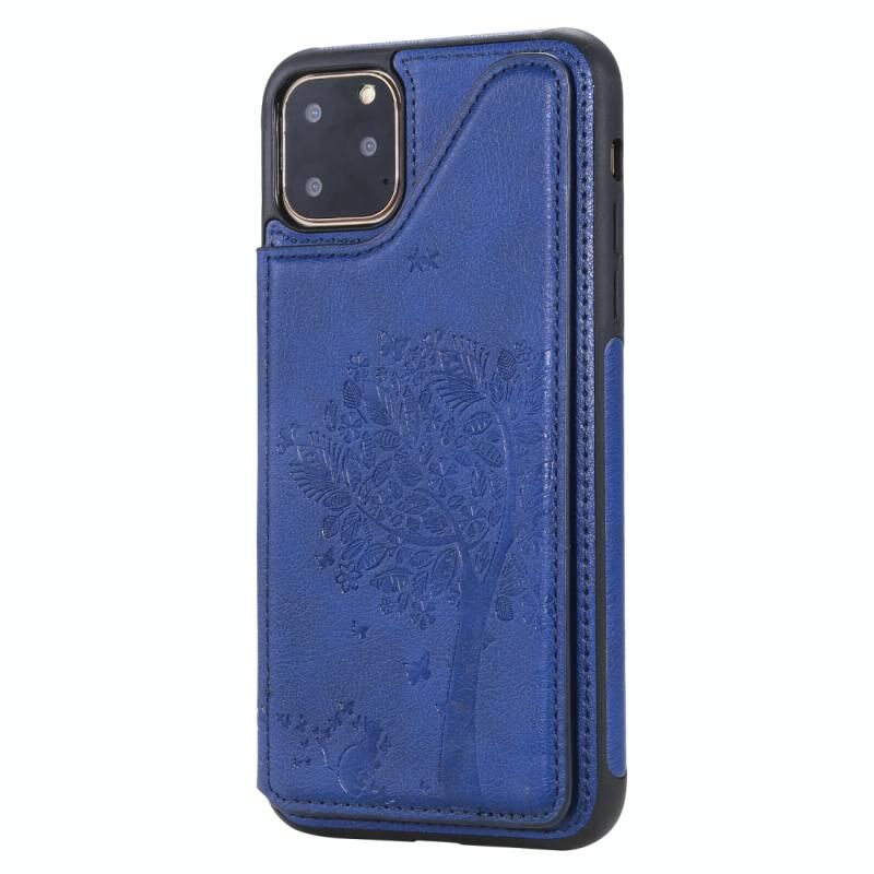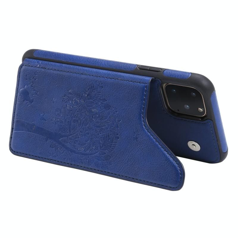For iPhone 11 Pro Max Cat Tree Embossing Pattern Shockproof Protective Case with Card Slots & Photo Frame & Holder(Blue)