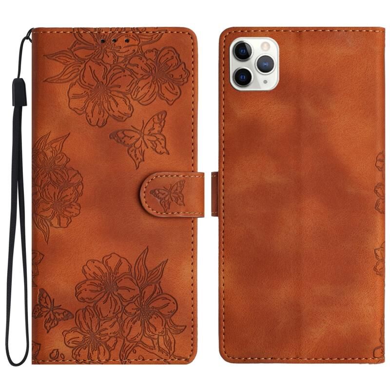 For iPhone 11 Pro Max Cherry Blossom Butterfly Skin Feel Embossed PU Phone Case(Brown)