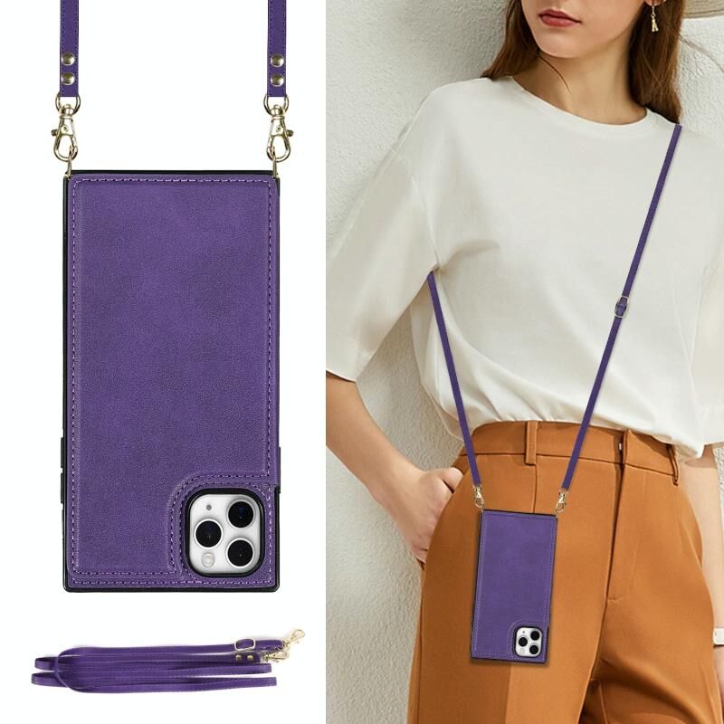 For iPhone 11 Pro Max Cross-body Square Double Buckle Flip Card Bag TPU+PU Case with Card Slots & Wallet & Photo & Strap (Purple)