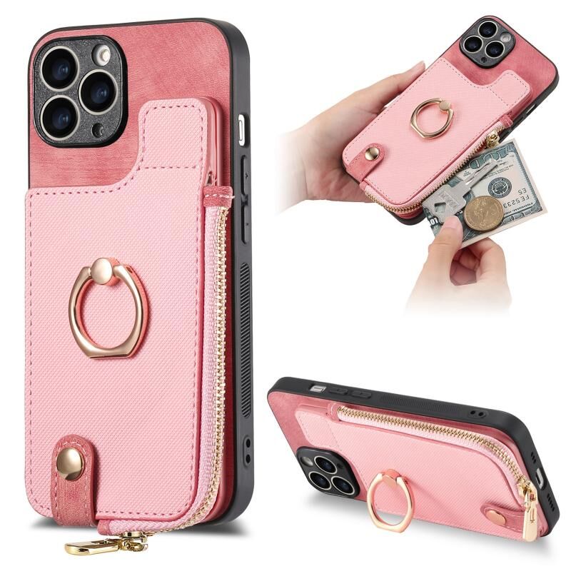 For iPhone 11 Pro max Cross Leather Ring Vertical Zipper Wallet Back Phone Case(Pink)