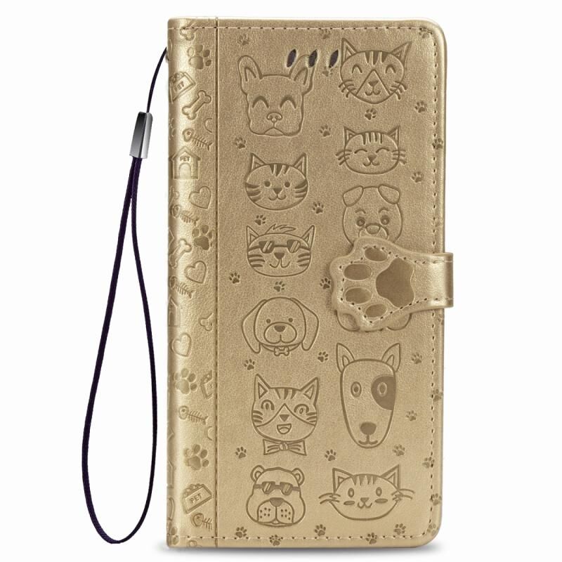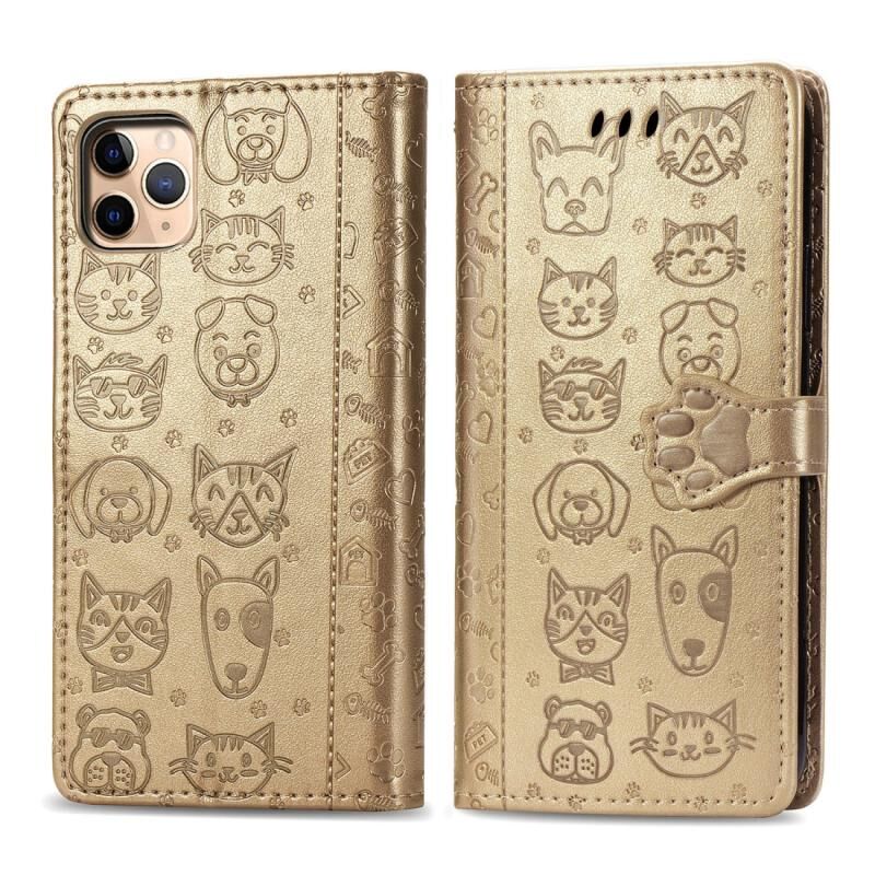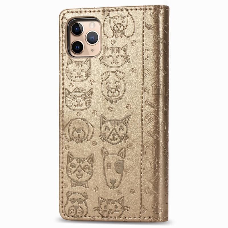 Θήκη για iPhone 11 Pro Max, χαριτωμένη με ανάγλυφα σχέδια γάτας και σκύλου, οριζόντια, από δερματίνη PU με βάση / υποδοχή κάρτας / πορτοφόλι / κορδόνι (Χρυσό Ρόδι)