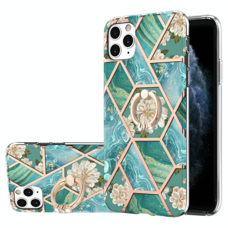 For iPhone 11 Pro Max Electroplating Splicing Marble Flower Pattern TPU Shockproof Case with Rhinestone Ring Holder (Blue Flower)