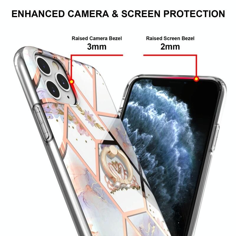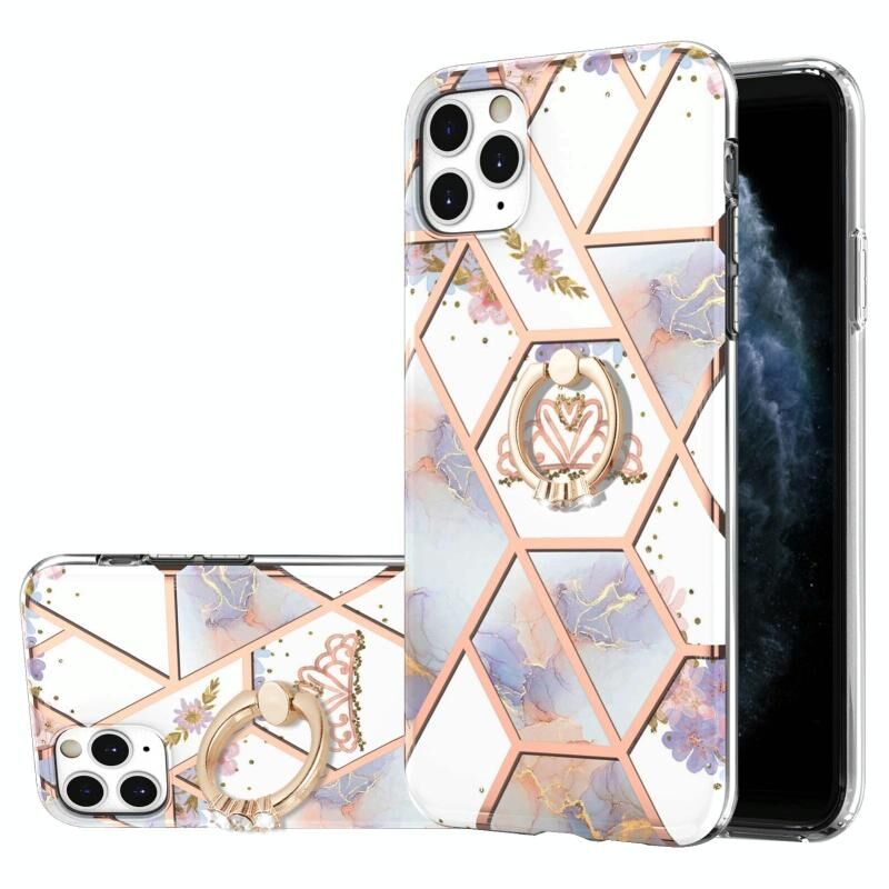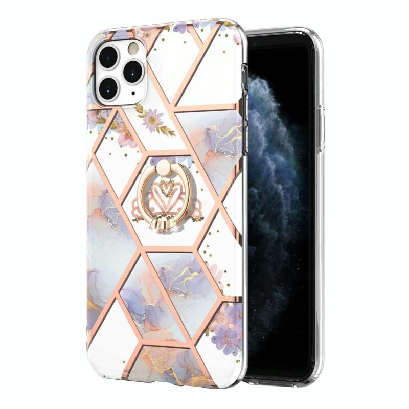 For iPhone 11 Pro Max Electroplating Splicing Marble Flower Pattern TPU Shockproof Case with Rhinestone Ring Holder (Imperial Crown)