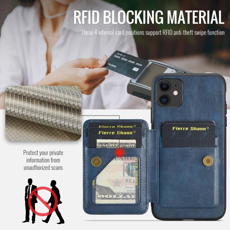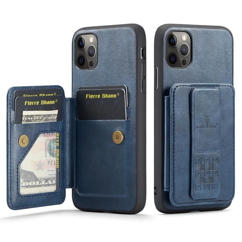 For iPhone 11 Pro Max Fierre Shann Oil Wax Cow Leather Card Holder Back Phone Case(Blue) (FIERRE SHANN)
