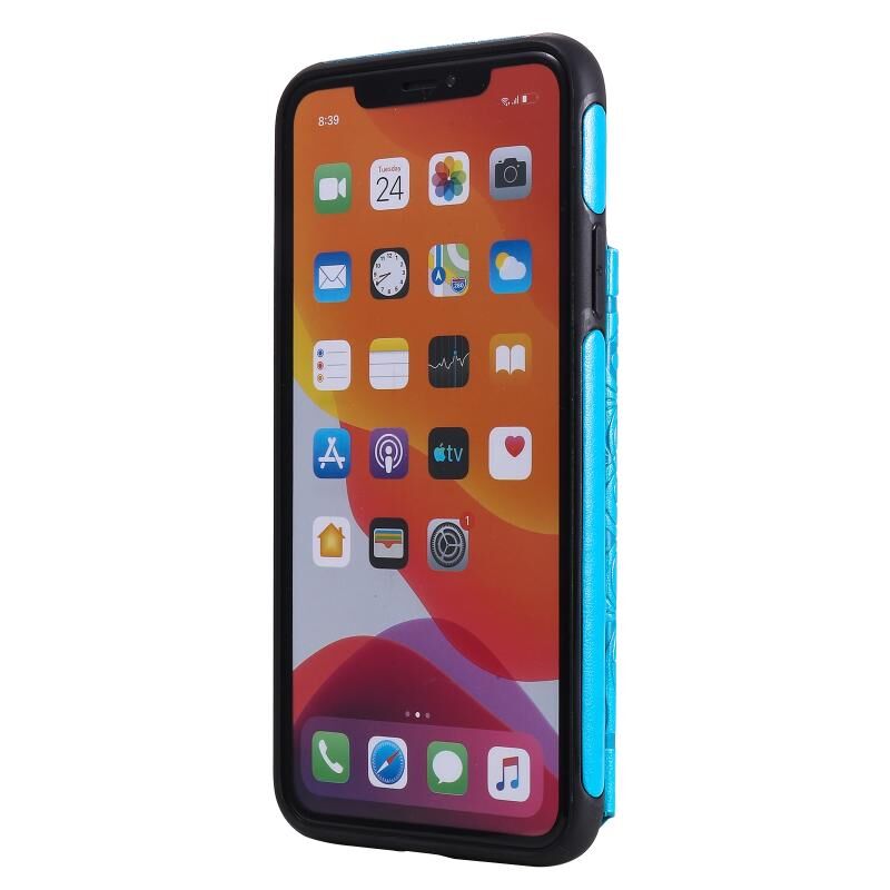 For iPhone 11 Pro Max Flower Embossing Pattern Shockproof Protective Case with Holder & Card Slots & Photo Frame(Blue)