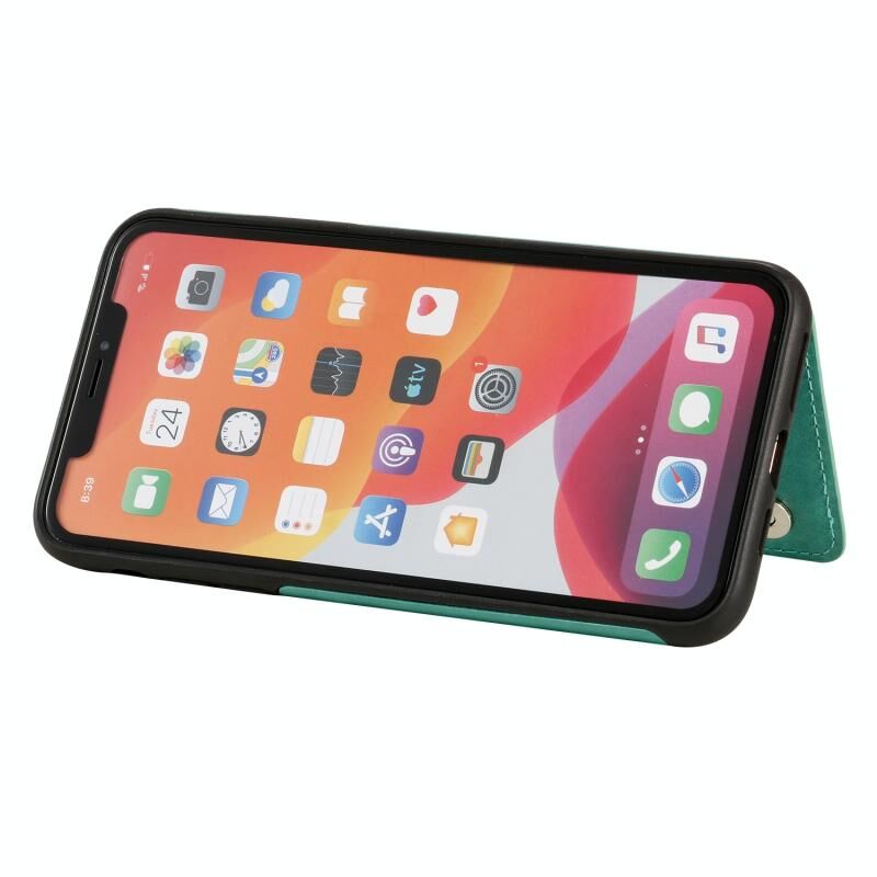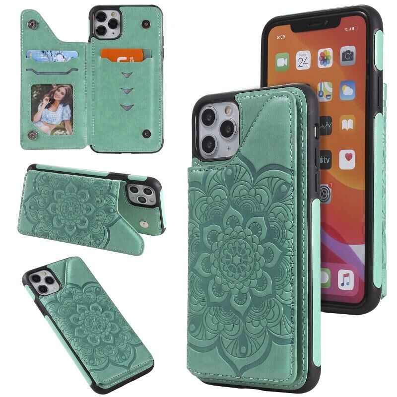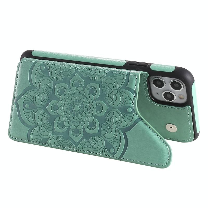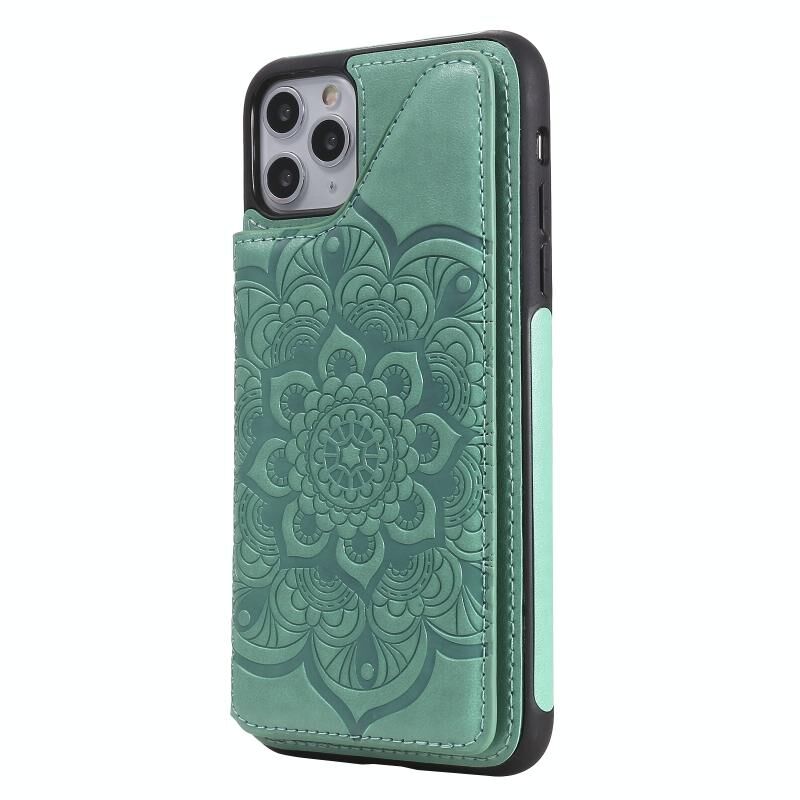 For iPhone 11 Pro Max Flower Embossing Pattern Shockproof Protective Case with Holder & Card Slots & Photo Frame(Green)