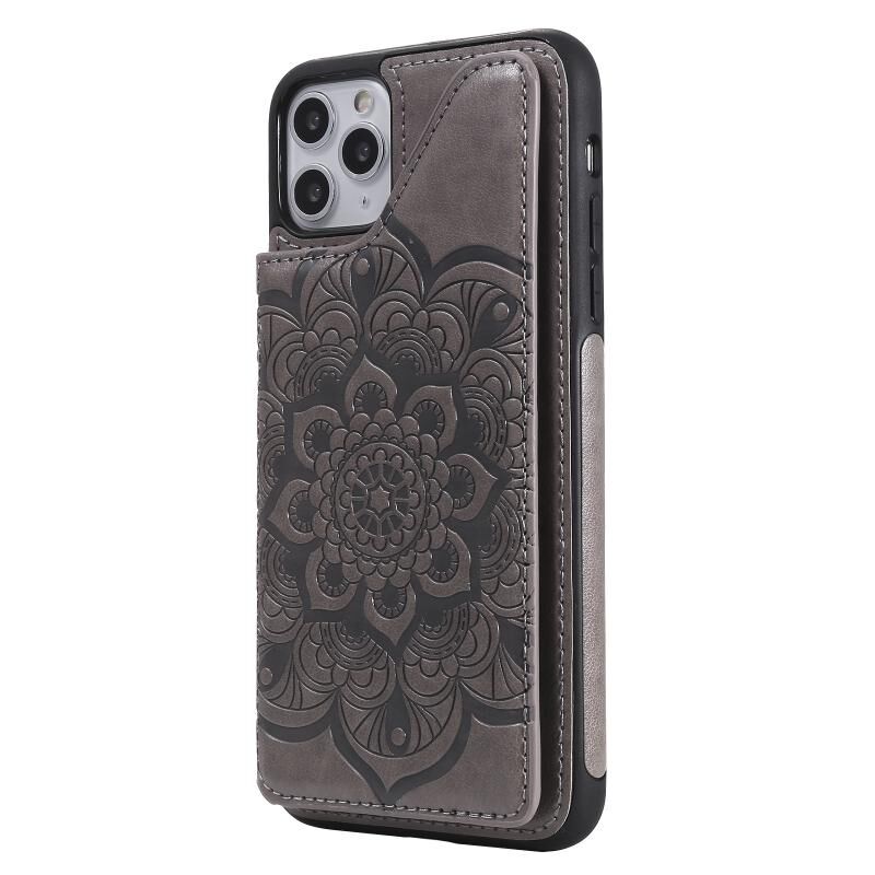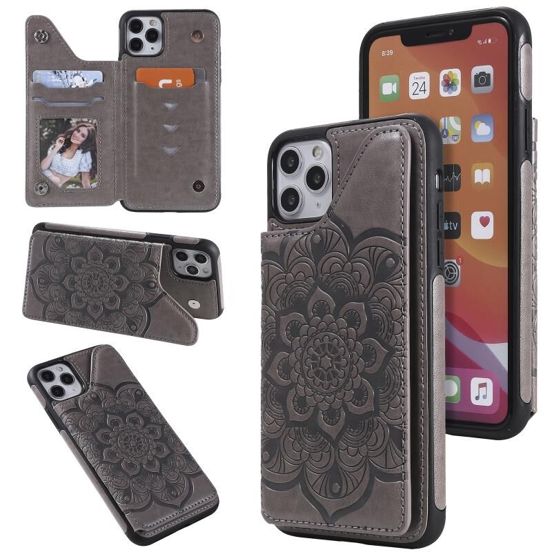 For iPhone 11 Pro Max Flower Embossing Pattern Shockproof Protective Case with Holder & Card Slots & Photo Frame(Grey)
