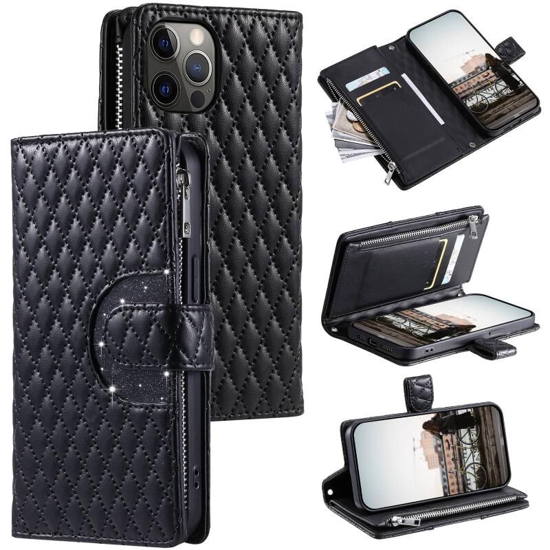 For iPhone 11 Pro Max Glitter Lattice Zipper Wallet Leather Phone Case(Black)