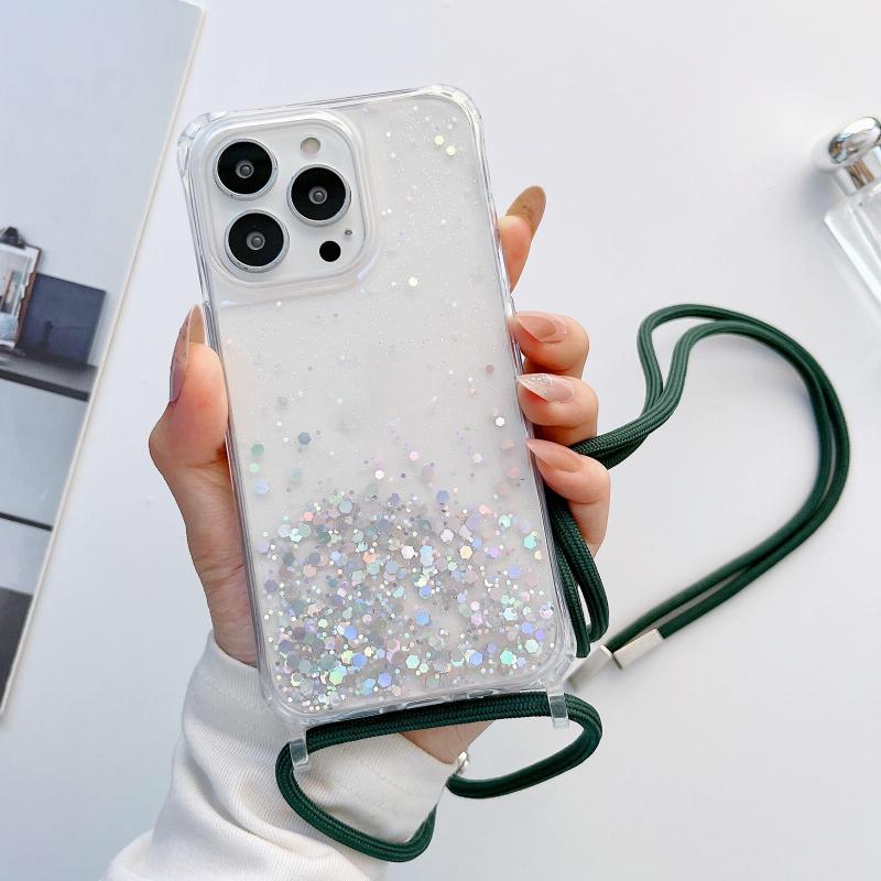 For iPhone 11 Pro Max Lanyard Glitter Epoxy Clear Phone Case (Dark Green)