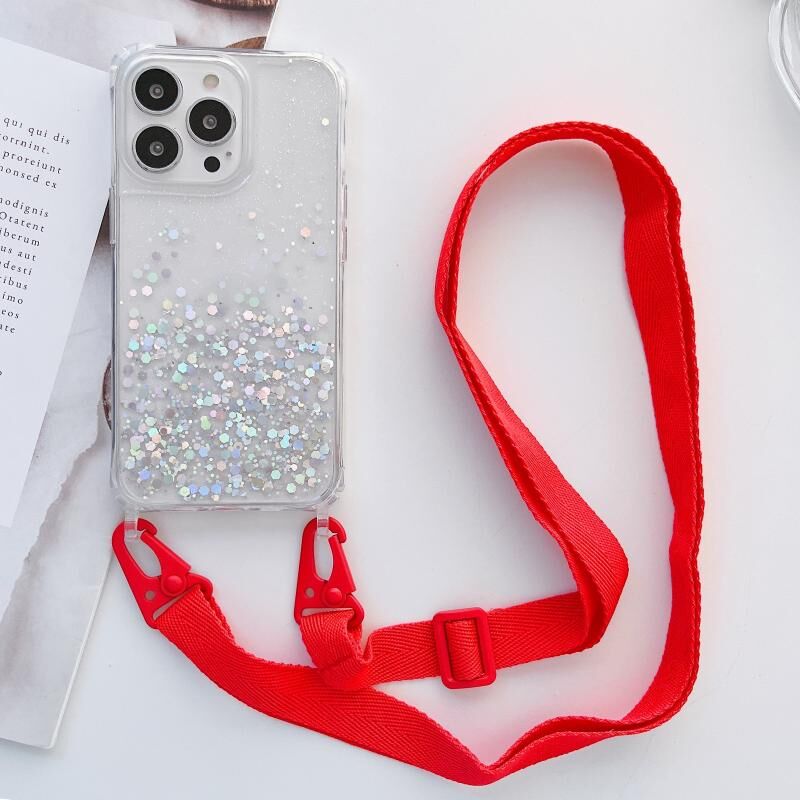 For iPhone 11 Pro Max Lanyard Glitter Epoxy Clear Phone Case (Red)