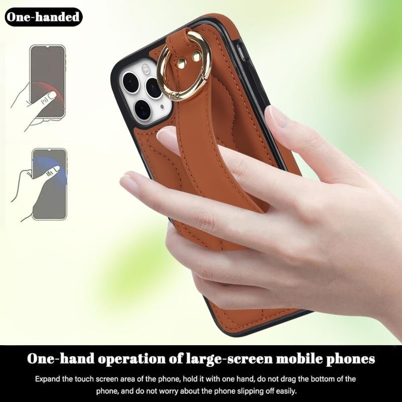 For iPhone 11 Pro Max Non-slip Full Coverage Ring PU Phone Case with Wristband(Brown)