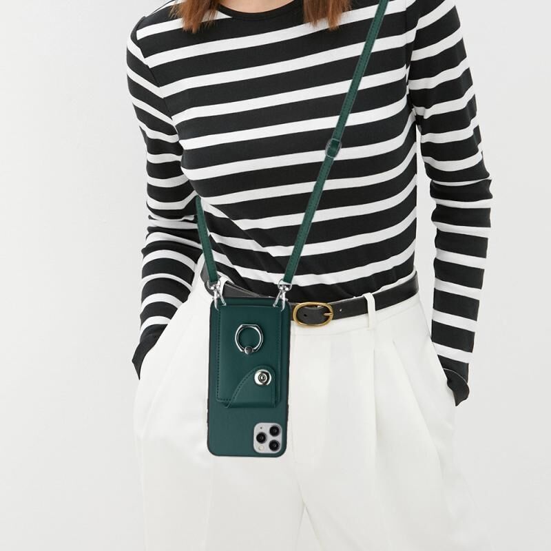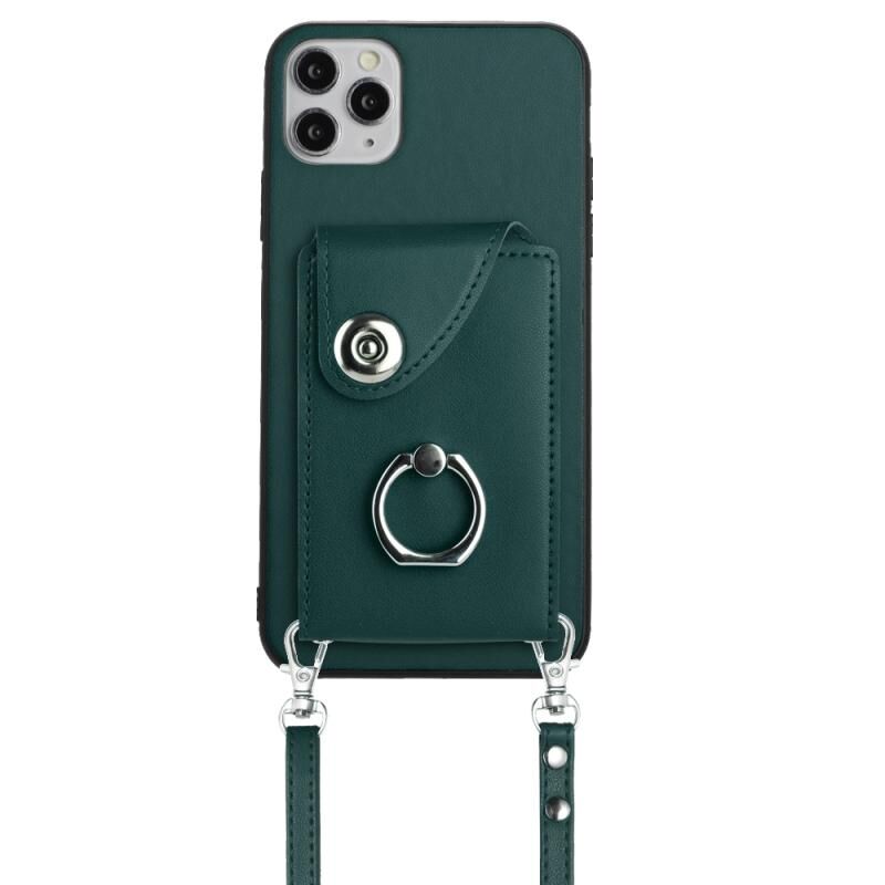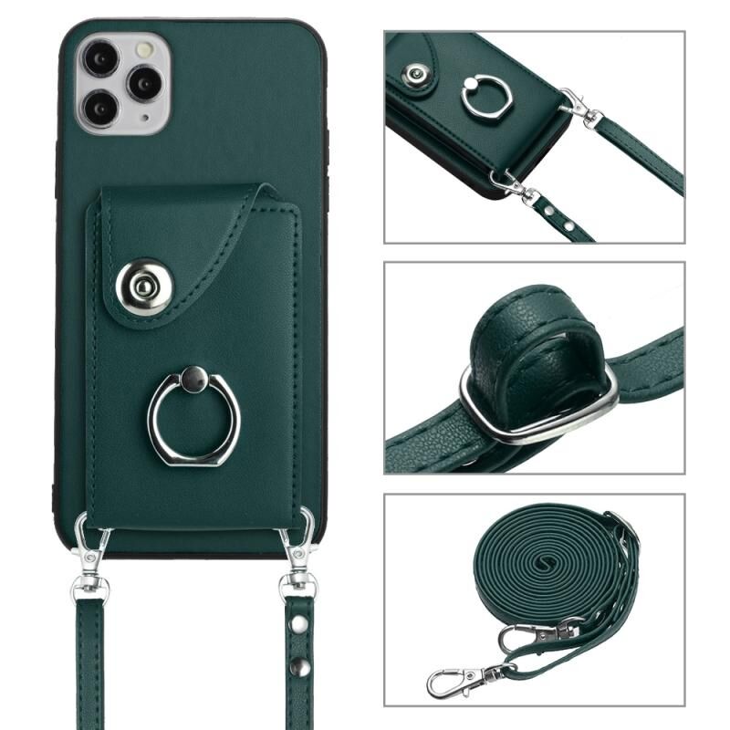 For iPhone 11 Pro Max Organ Card Bag Ring Holder Phone Case with Long Lanyard(Green)