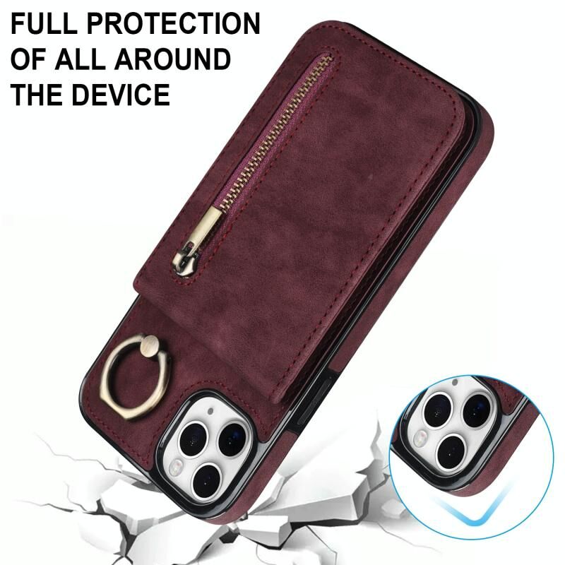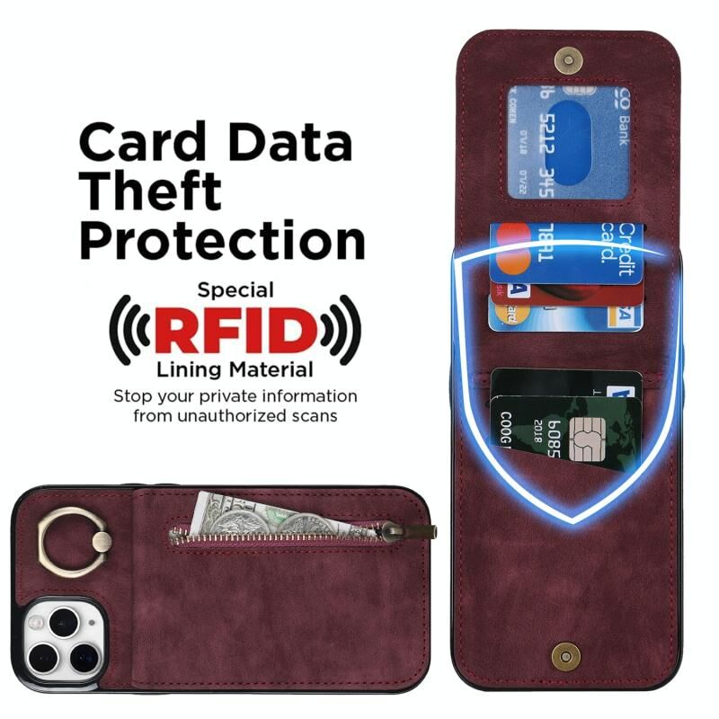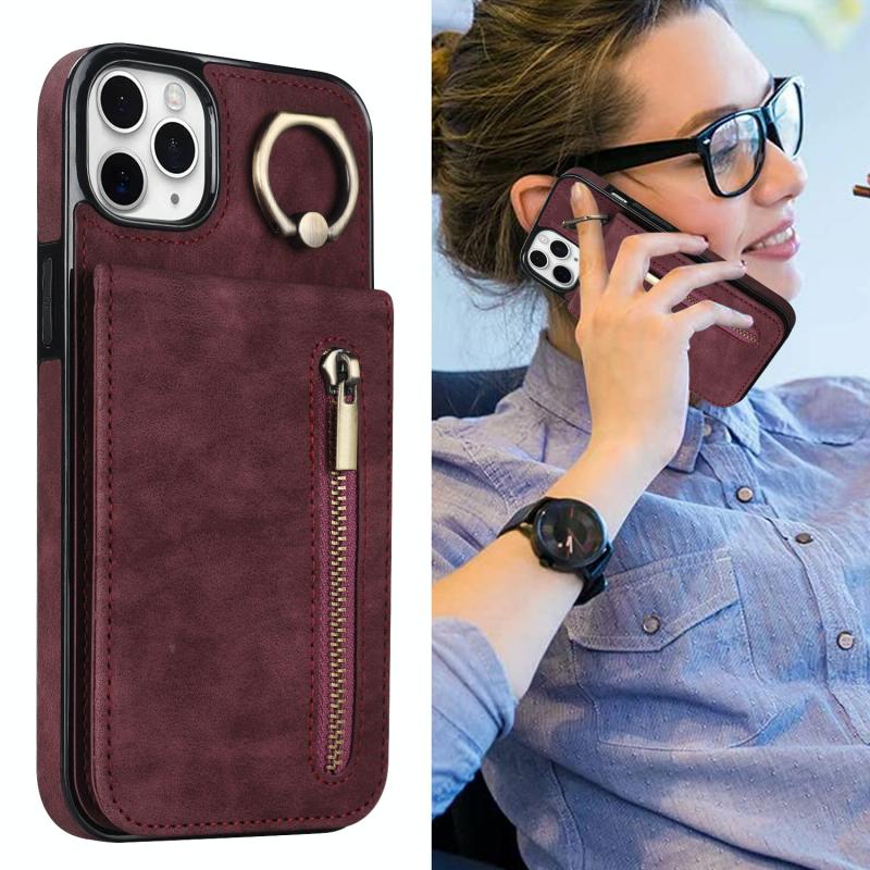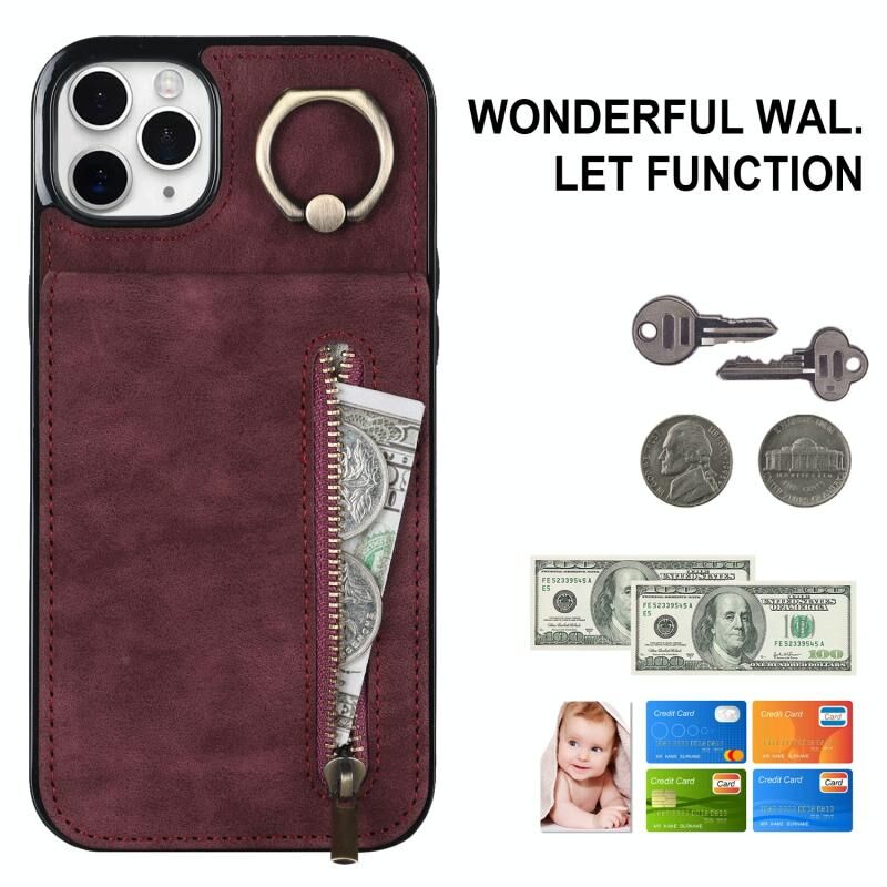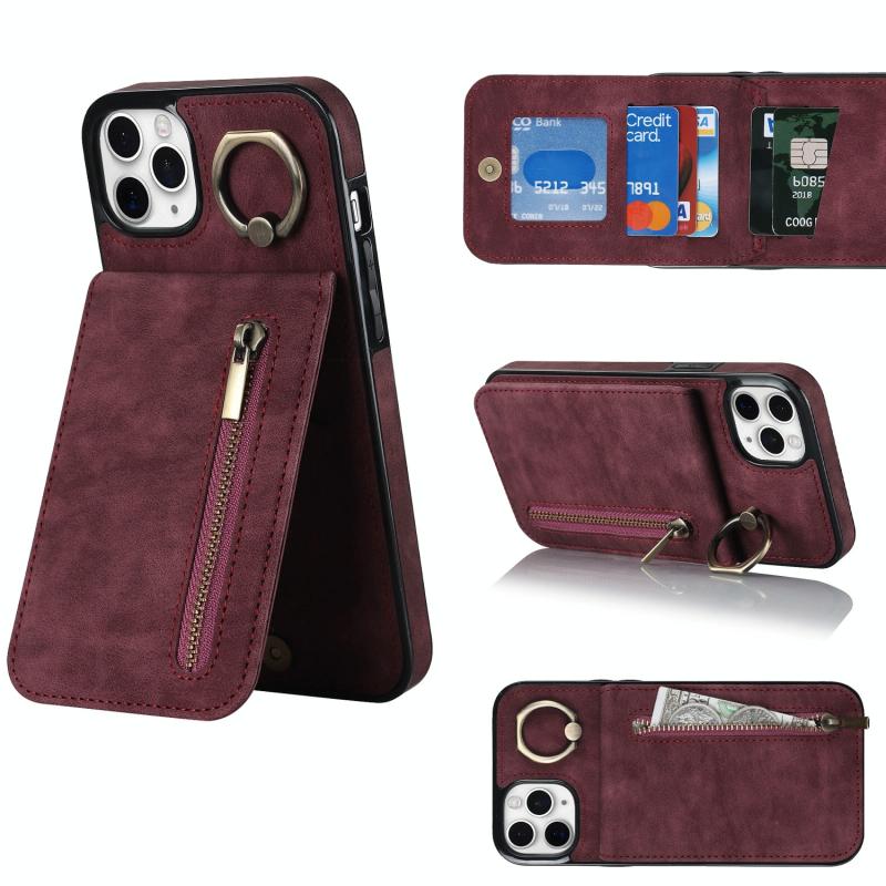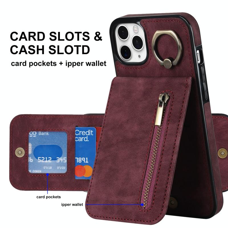 For iPhone 11 Pro Max Retro Ring and Zipper RFID Card Slot Phone Case(Wine Red)