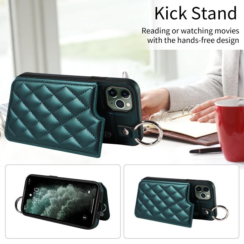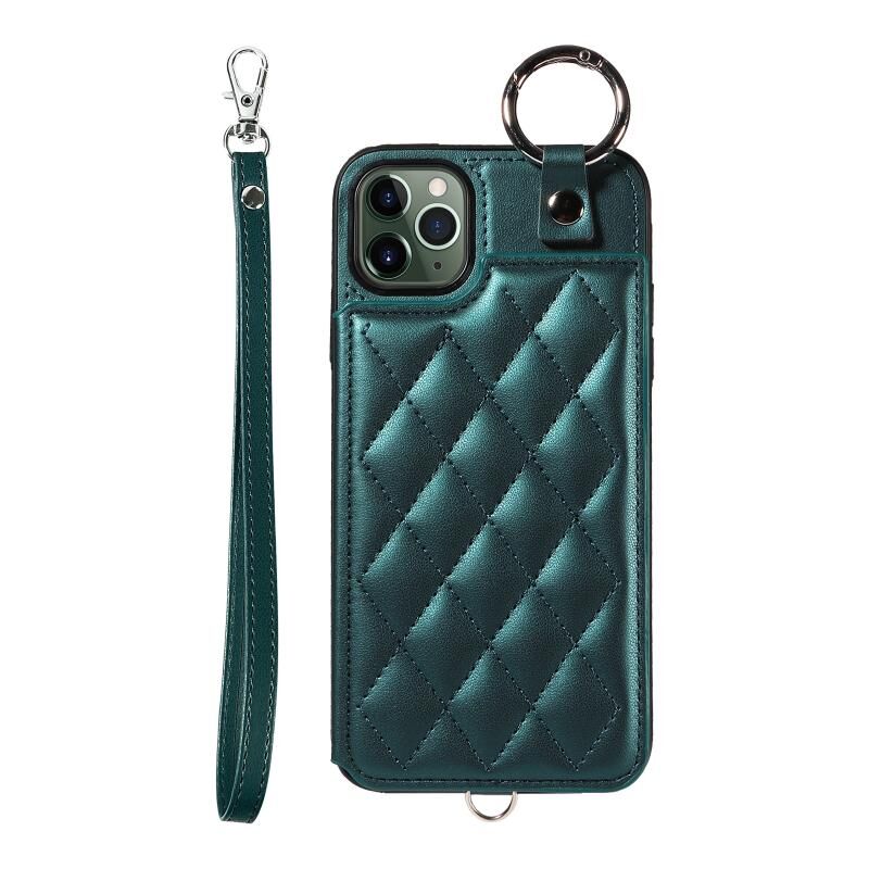 For iPhone 11 Pro Max Rhombic Texture Card Bag Phone Case with Short Lanyard(Green)