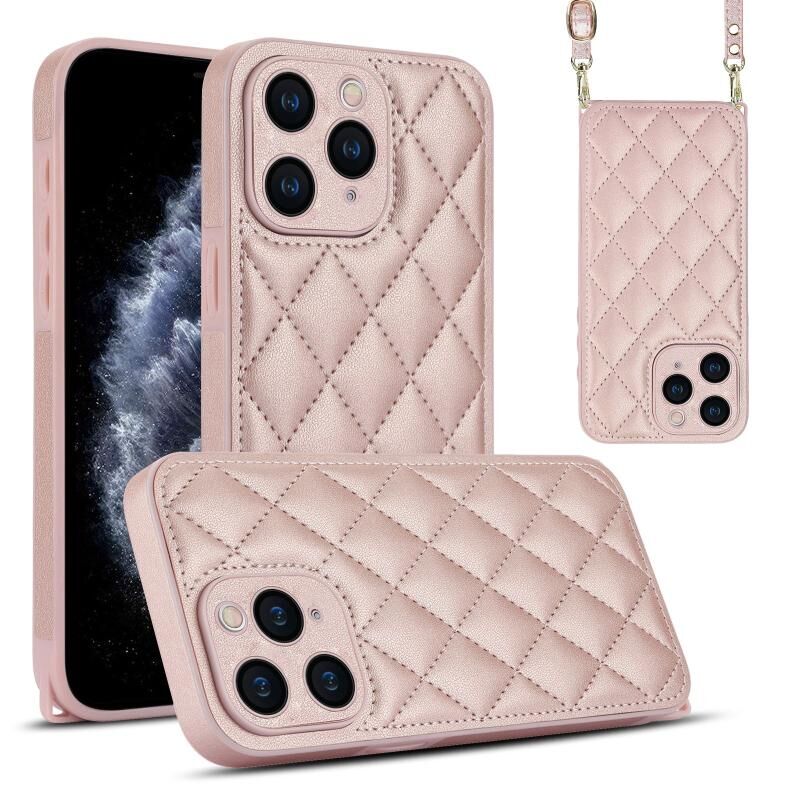 For iPhone 11 Pro Max Rhombic Texture Phone Case with Dual Lanyard(Rose Gold)