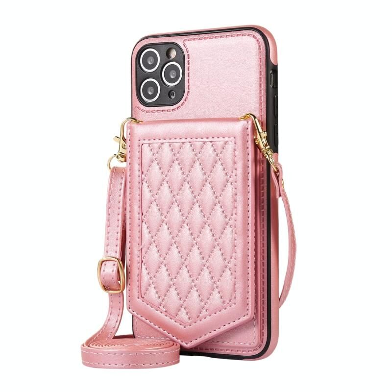 For iPhone 11 Pro Max Rhombic Texture RFID Phone Case with Lanyard & Mirror(Rose Gold)