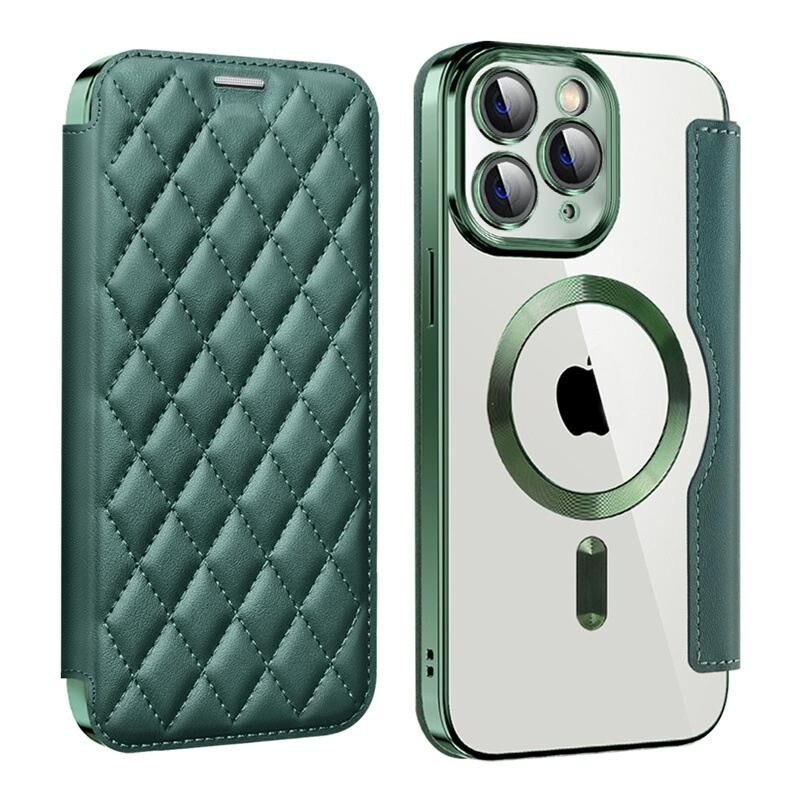 For iPhone 11 Pro Max Shield Magsafe RFID Anti-theft Rhombus Leather Phone Case(Green)