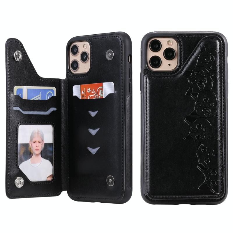 For iPhone 11 Pro Max Six Cats Embossing Pattern Protective Case with Holder & Card Slots & Photo Frame(Black)