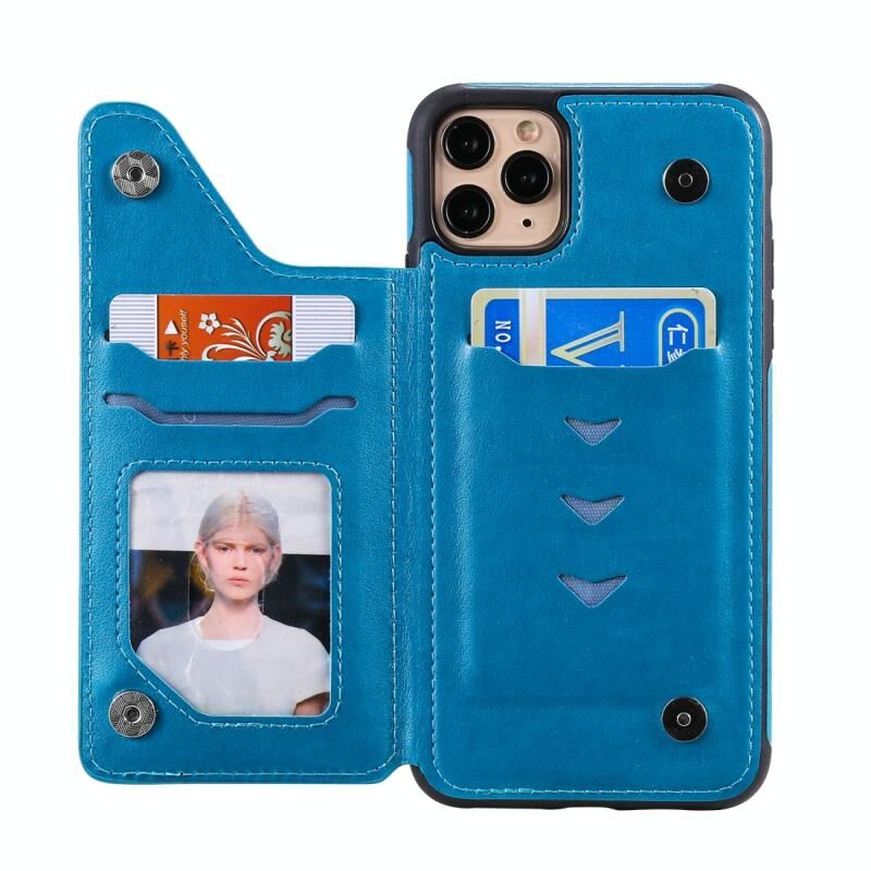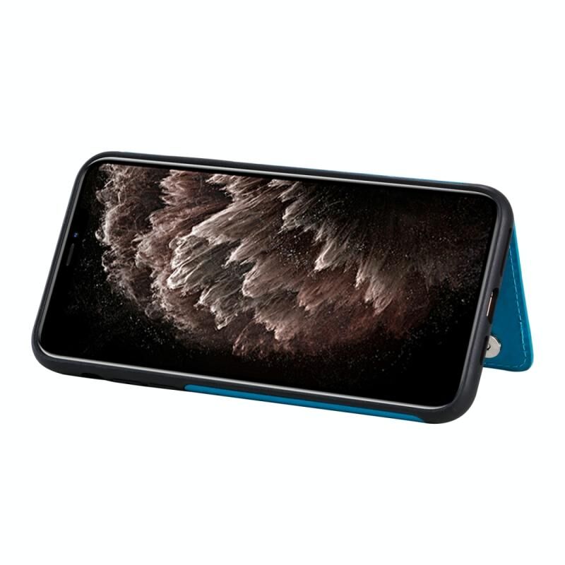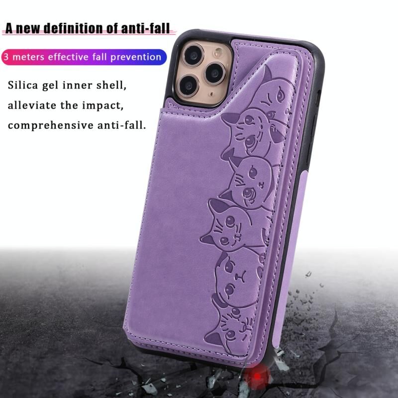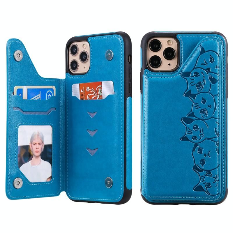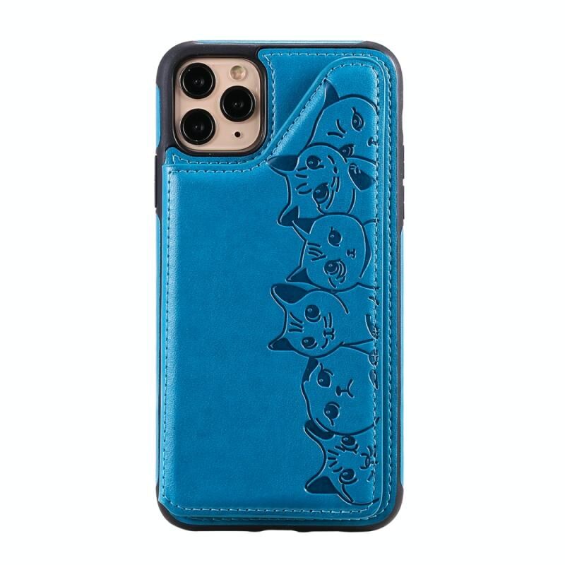 For iPhone 11 Pro Max Six Cats Embossing Pattern Protective Case with Holder & Card Slots & Photo Frame(Blue)