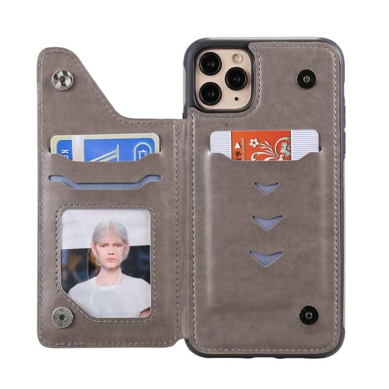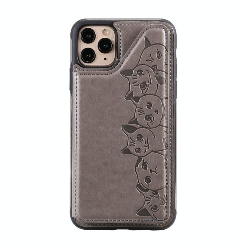 For iPhone 11 Pro Max Six Cats Embossing Pattern Protective Case with Holder & Card Slots & Photo Frame(Grey)