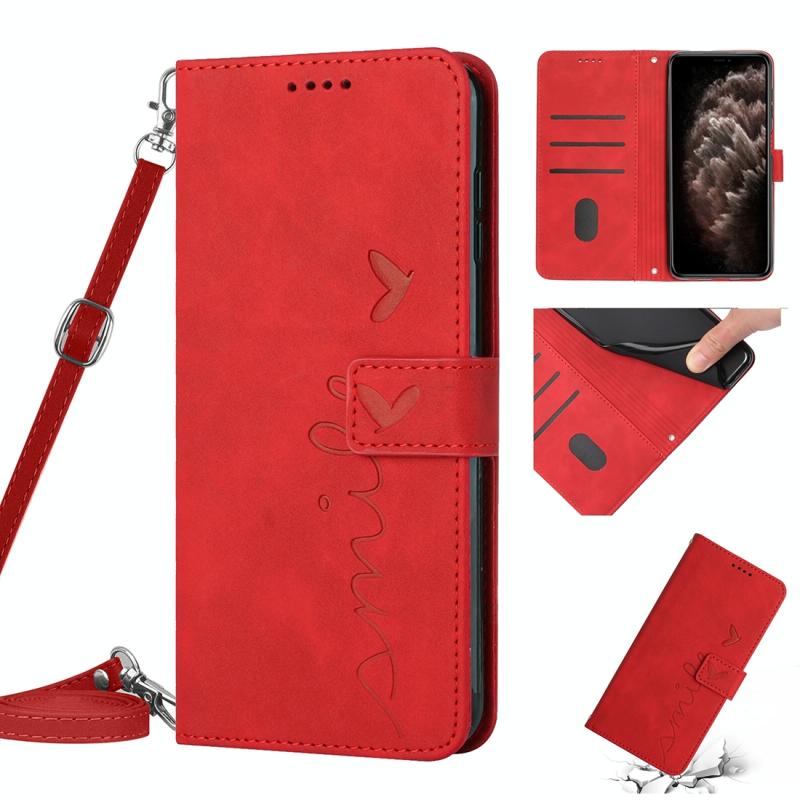 For iPhone 11 Pro Max Skin Feel Heart Pattern Leather Phone Case With Lanyard (Red)
