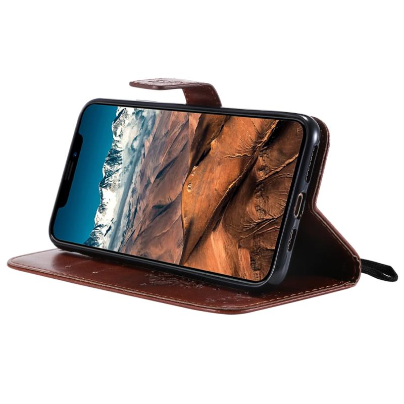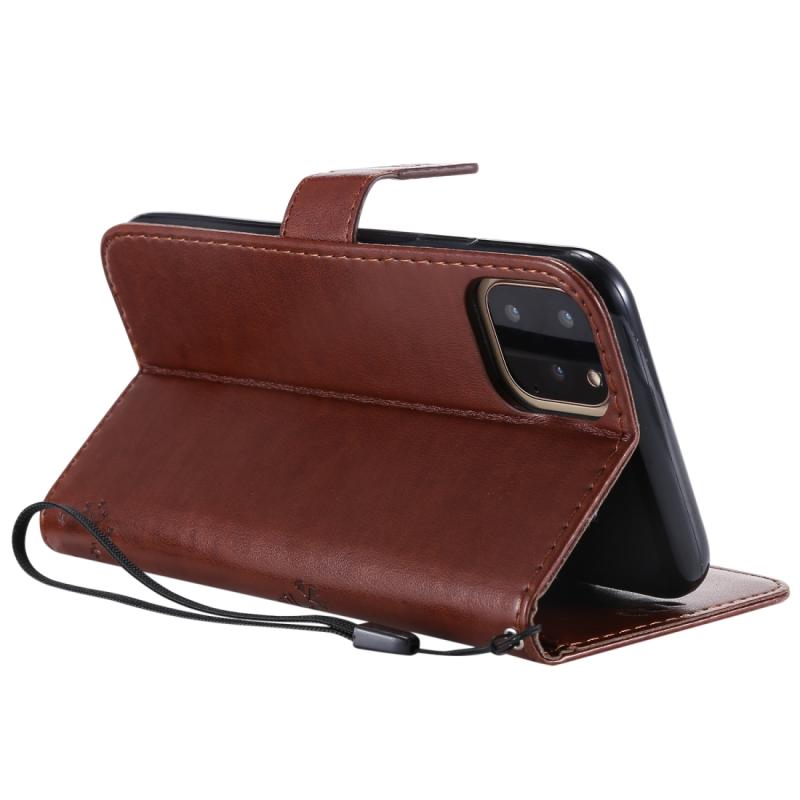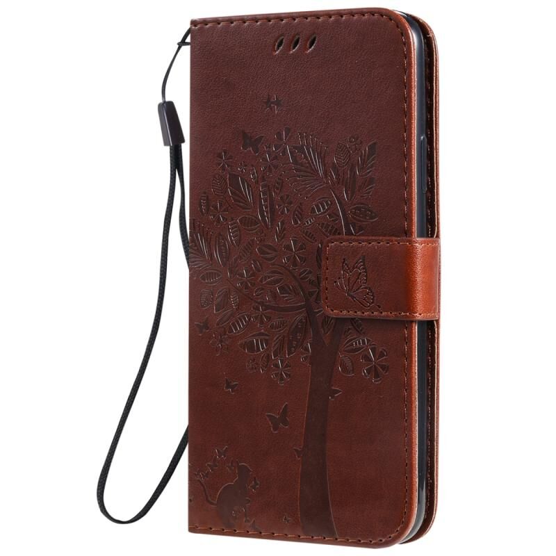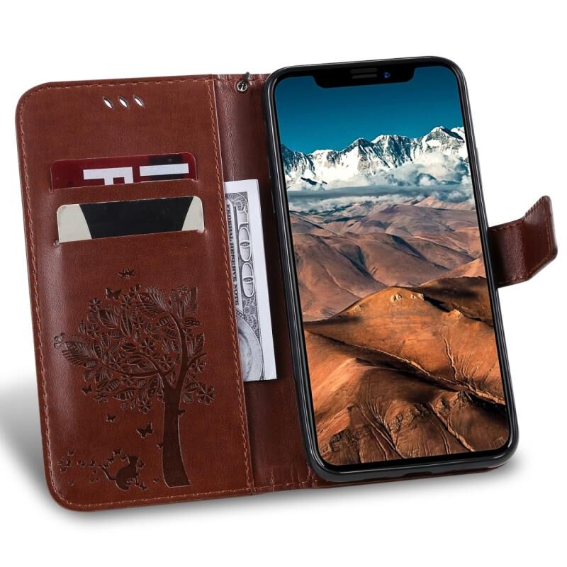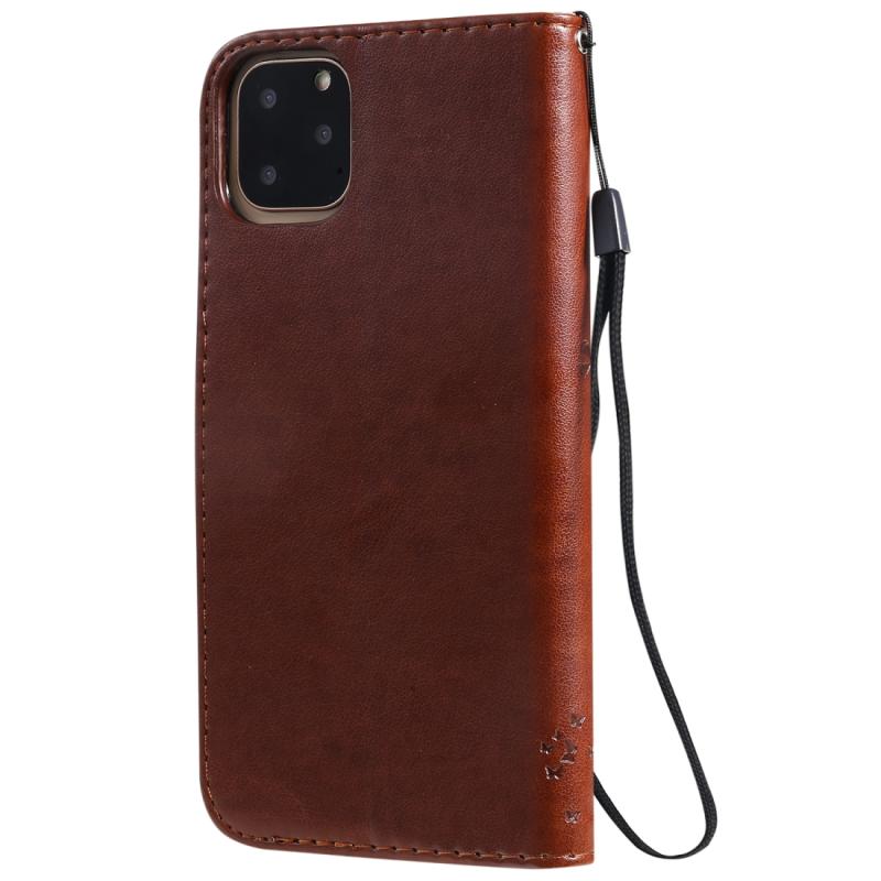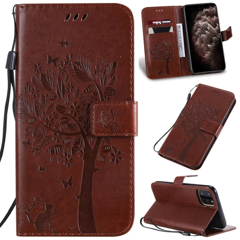 For iPhone 11 Pro Max Tree & Cat Pattern Pressed Printing Horizontal Flip PU Leather Case with Holder & Card Slots & Wallet & Lanyard (Brown)