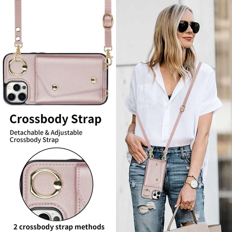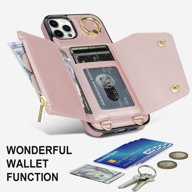 For iPhone 11 Pro Max Zipper Card Bag Phone Case with Dual Lanyard(Rose Gold)