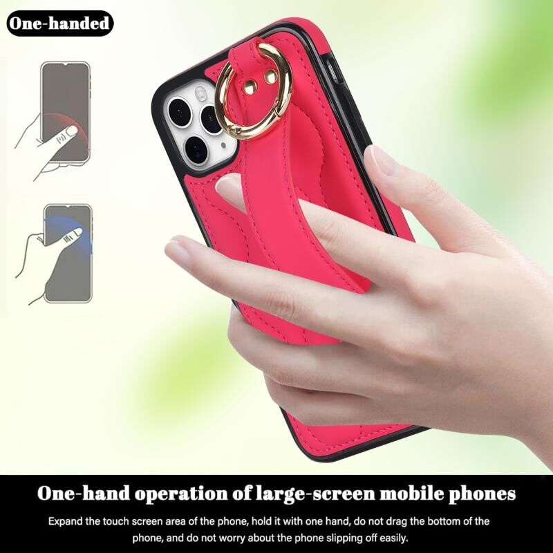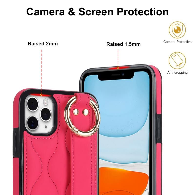 For iPhone 11 Pro Non-slip Full Coverage Ring PU Phone Case with Wristband(Rose Red)