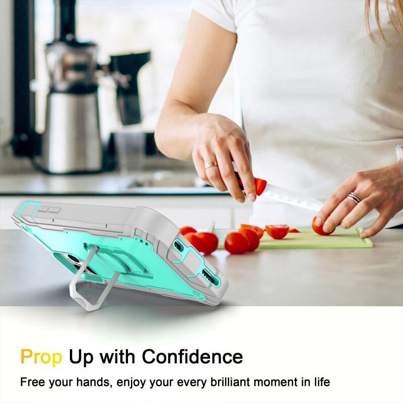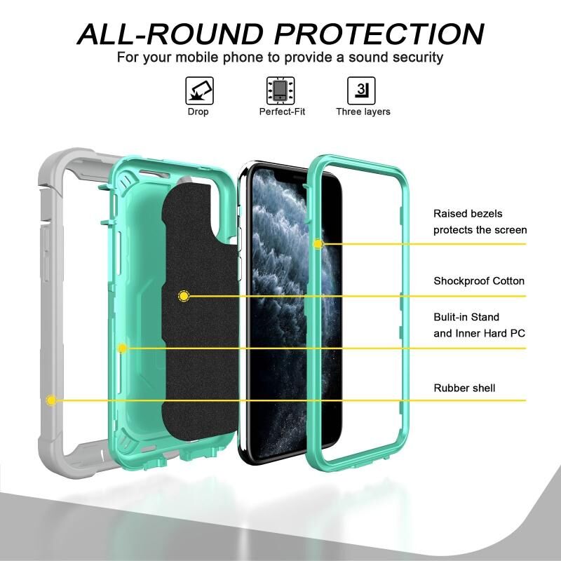 For iPhone 11 Pro PC + Rubber 3-layers Shockproof Protective Case with Rotating Holder (Grey White + Mint Green)