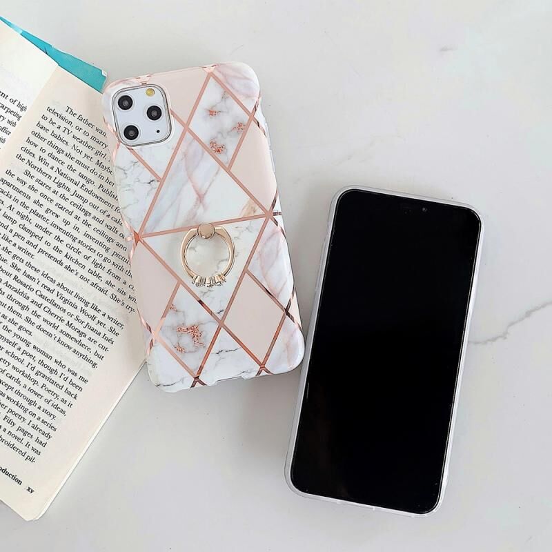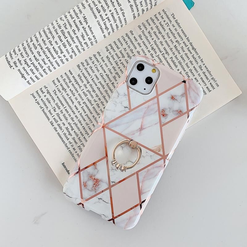 Θήκη κινητού τηλεφώνου για iPhone 11 Pro με επιμετάλλωση, πολύχρωμο γεωμετρικό σχέδιο, μωσαϊκό, μαρμάρινη TPU με δαχτυλίδι στήριξης από ρητίνη (Λευκό PR3)