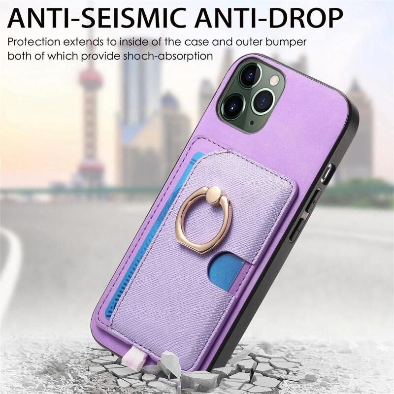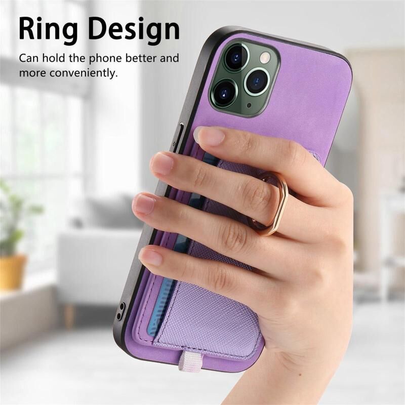For iPhone 11 Pro Retro Cross Leather Ring Side Insert Card Bag MagSafe Phone Case(Purple)