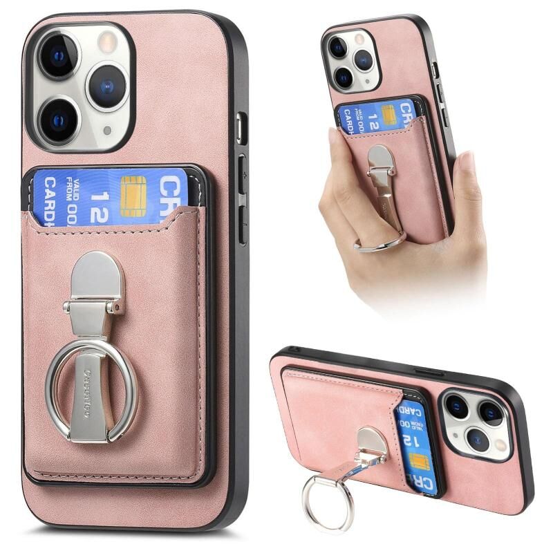 For iPhone 11 Pro Retro Folding Ring Holder Card Bag MagSafe Phone Case(Pink)