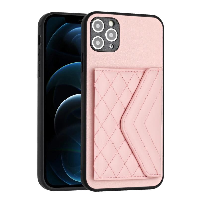 For iPhone 11 Pro Rhombic Texture Card Bag RFID Phone Case with Long Lanyard(Rose Gold)