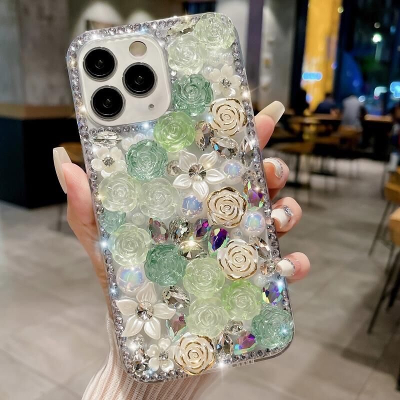 For iPhone 11 Pro Rose Hand-set Pearl Diamond PC Phone Case(Green)