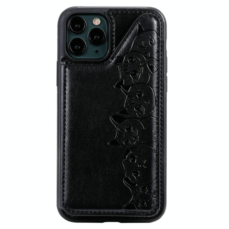 For iPhone 11 Pro Six Cats Embossing Pattern Protective Case with Holder & Card Slots & Photo Frame(Black)